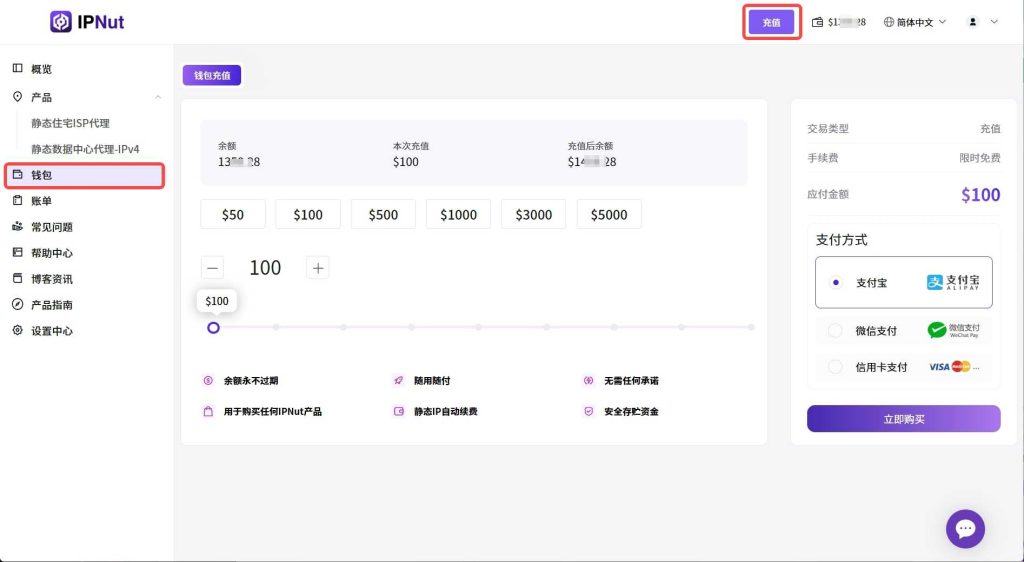 钱包充值目前有三种充值方式支付宝、微信支付、信用卡,请输入需要充值的额度,选择适合的支付方式点击立即购买就可以进行支付。支付成功后会显示最新余额。如有疑问请联系客服人员解决。